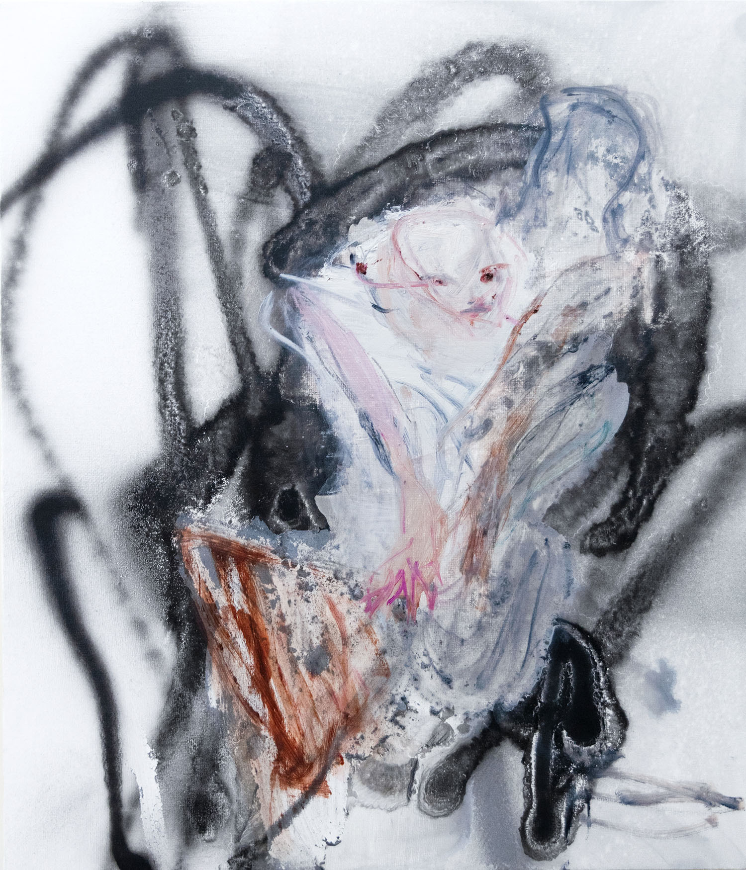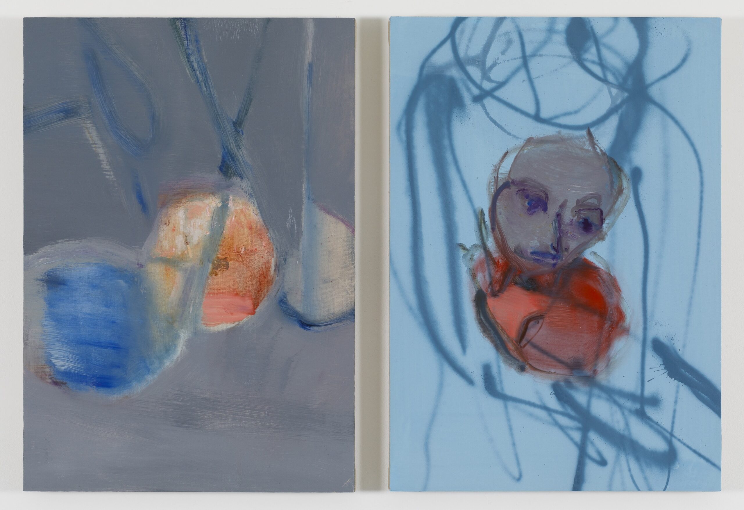 右:Fumika Tsuchitori, I and You (Embrace), 2025, oil and spray on canvas panel, 530 × 455 mm