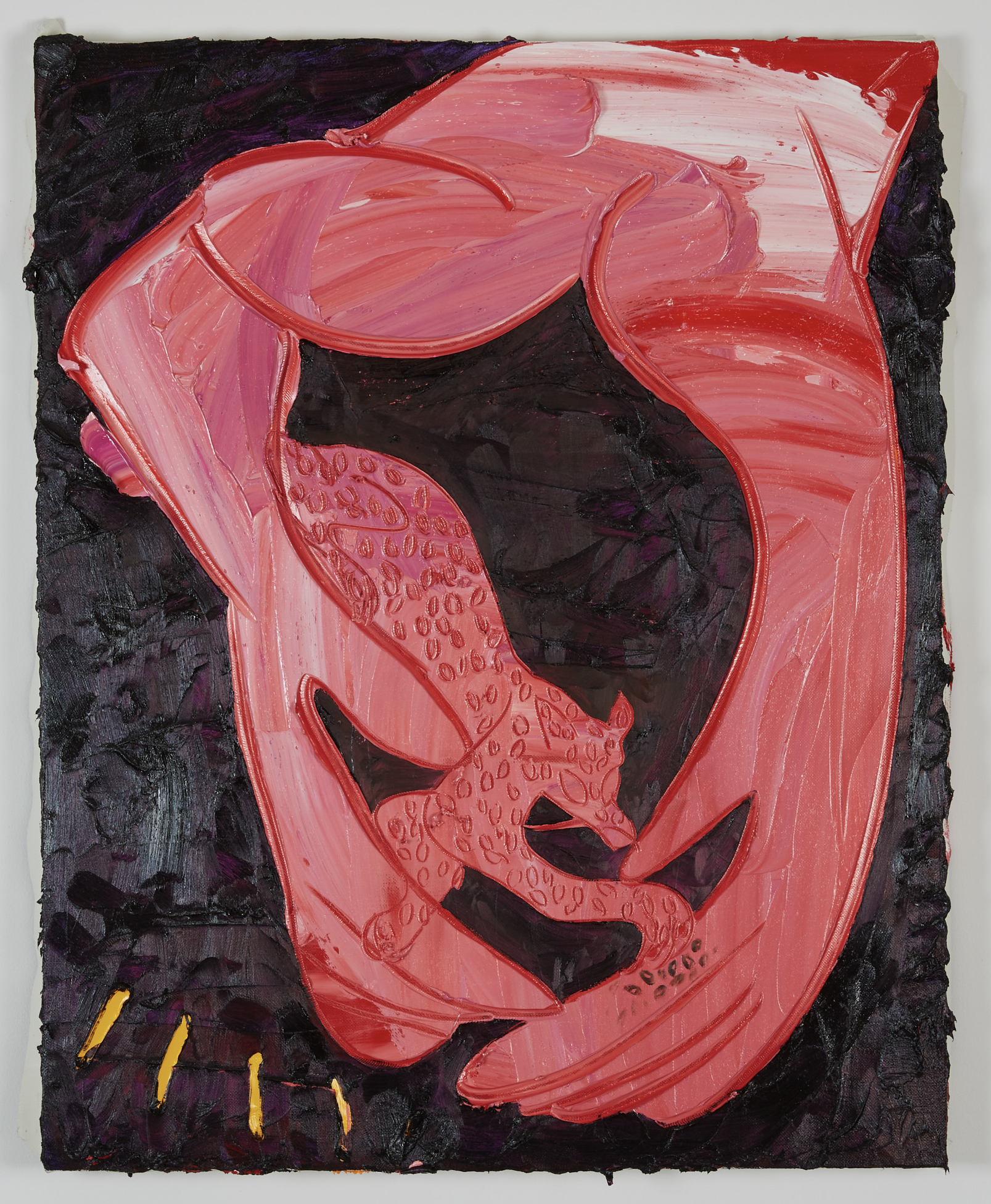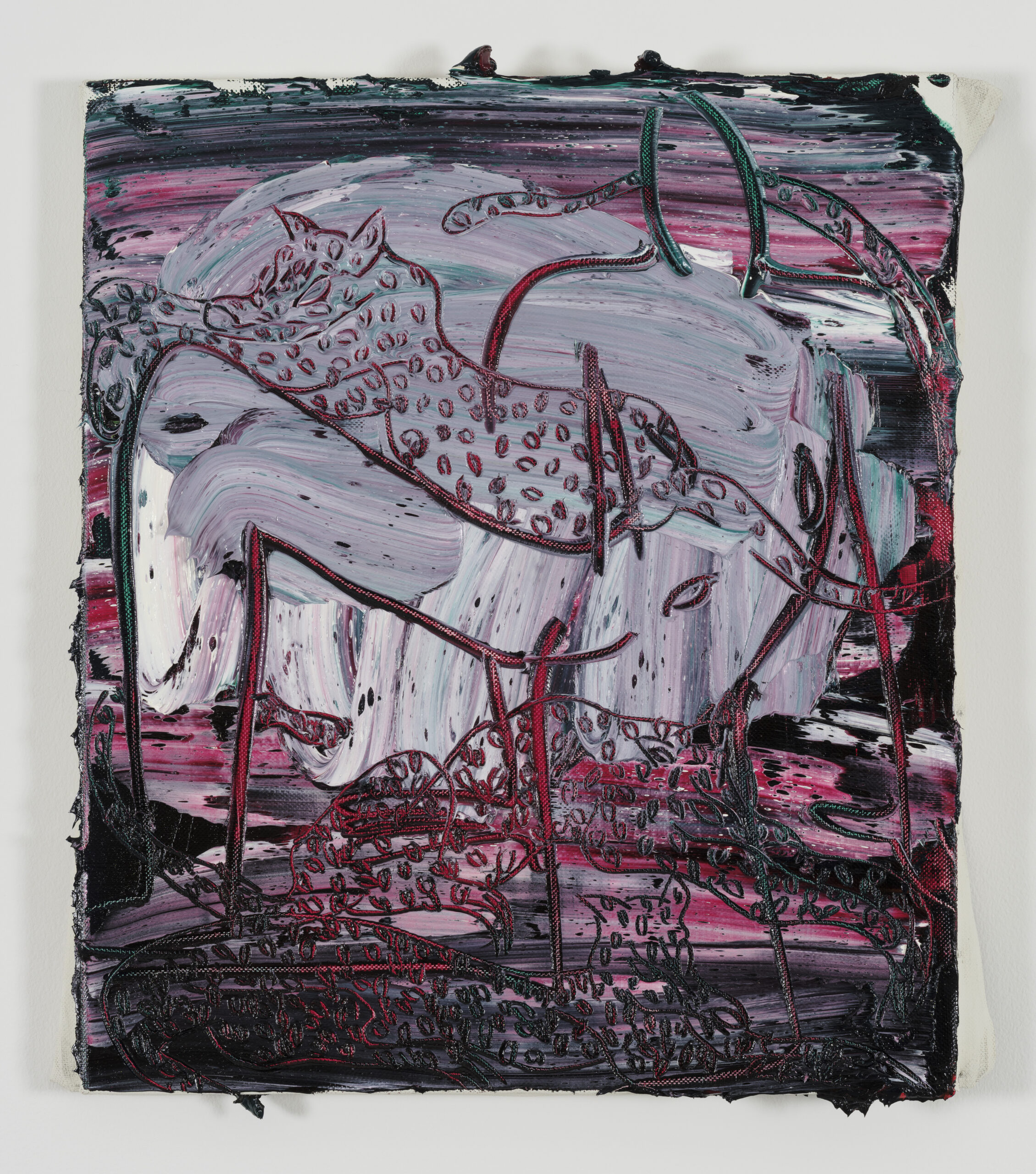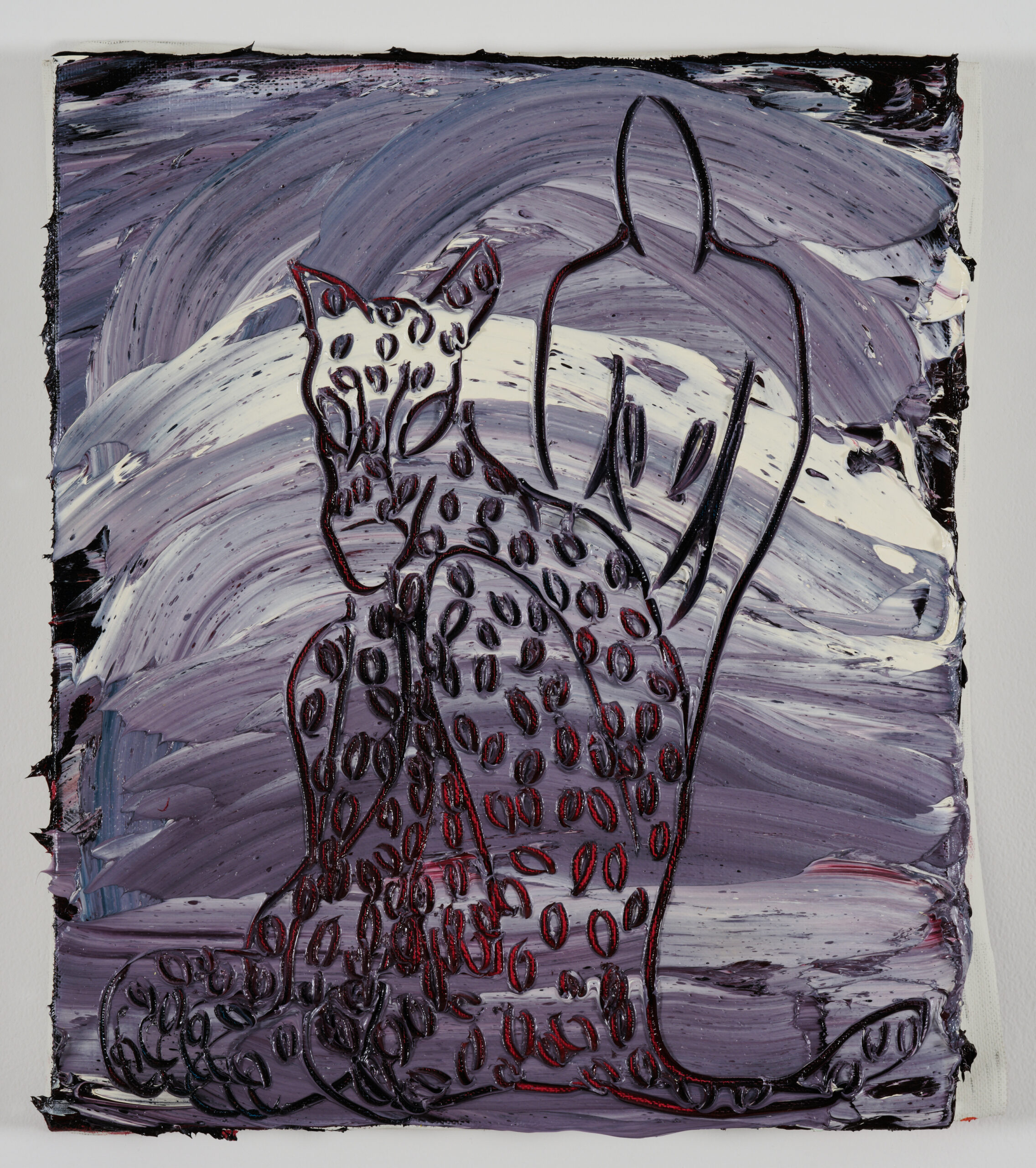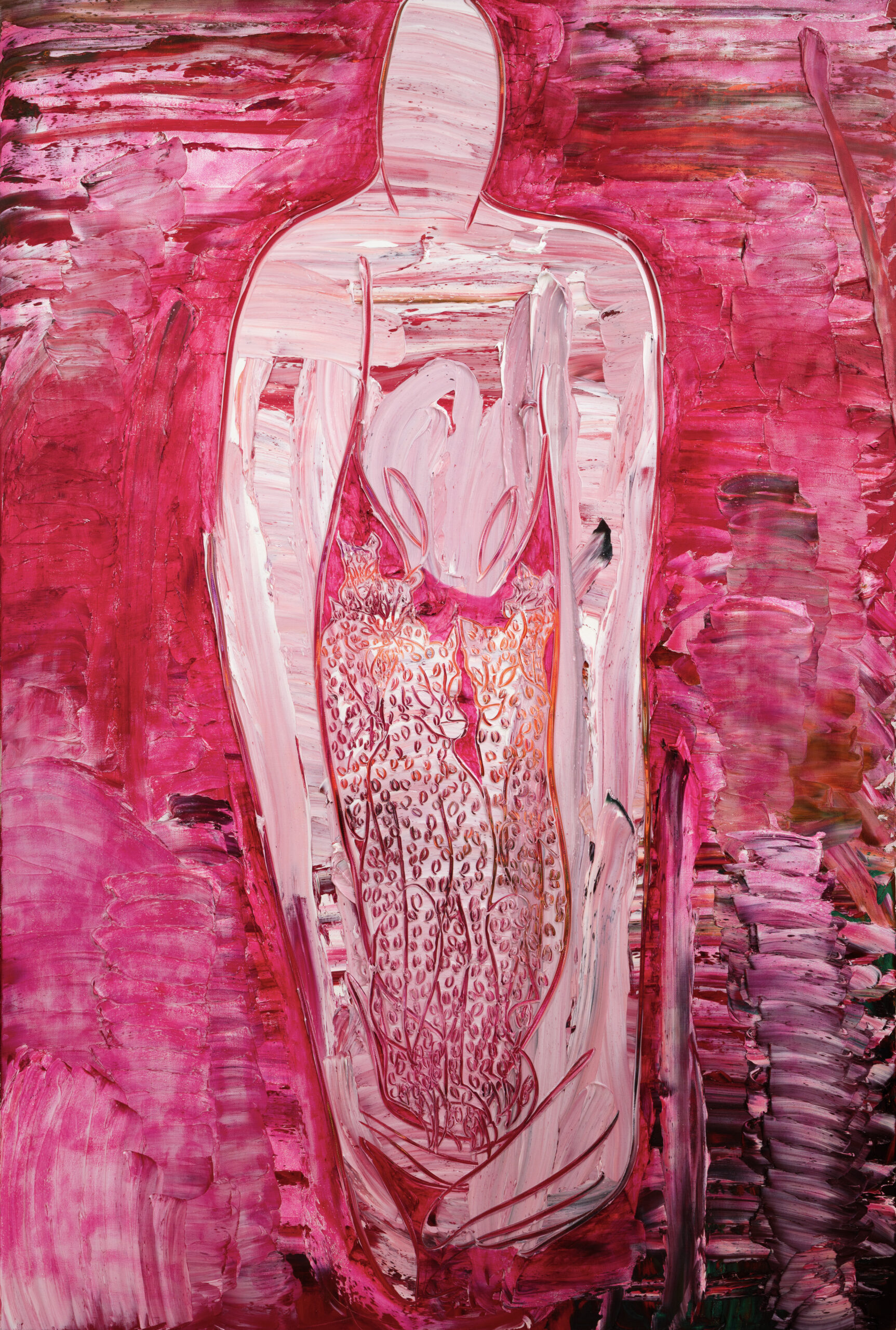 川内理香子の絵画では、油絵具とメディウムの混成による顔料を、キャンバスに幾層にも塗り重ね、厚く拡がったその表層――それはあたかも生物の内臓の襞のようだ――をペインティングナイフで鋭く刻む行為によって、画面の内に形象を浮かび上がらせている。そこで繰り返し描かれてきたのは、クロード・レヴィ=ストロースが神話の構造分析において抽出したジャガーやコヨーテ、ナマケモノ、蛇といった様々な動物たちであり、展覧会のタイトルが指し示すように、本展においてその対象は人間と虎、そして両者の関係に光が当てられている。