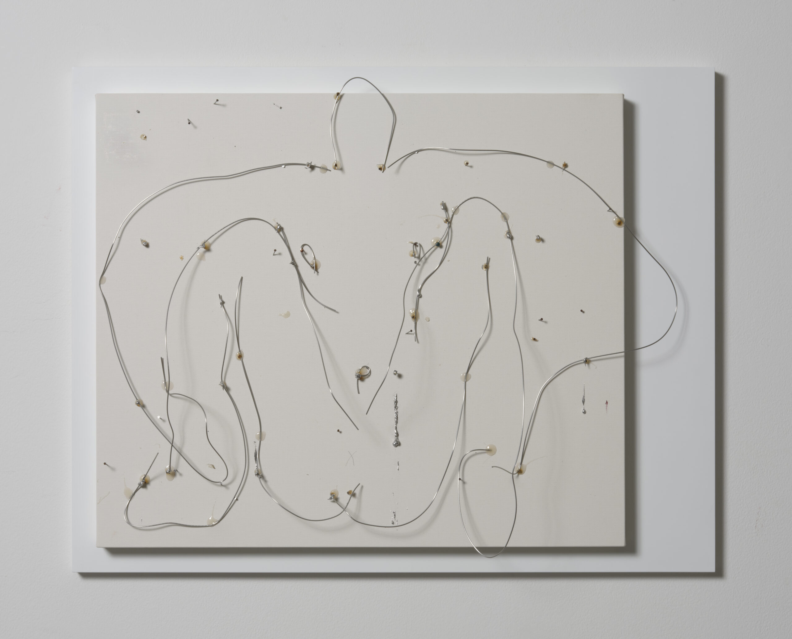 左:Sitting, 2025, wire and pin on panel, 665 × 525 × 140 mm