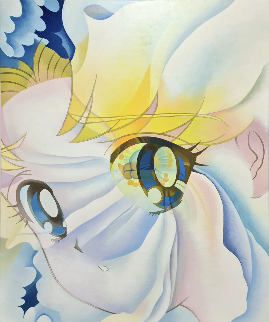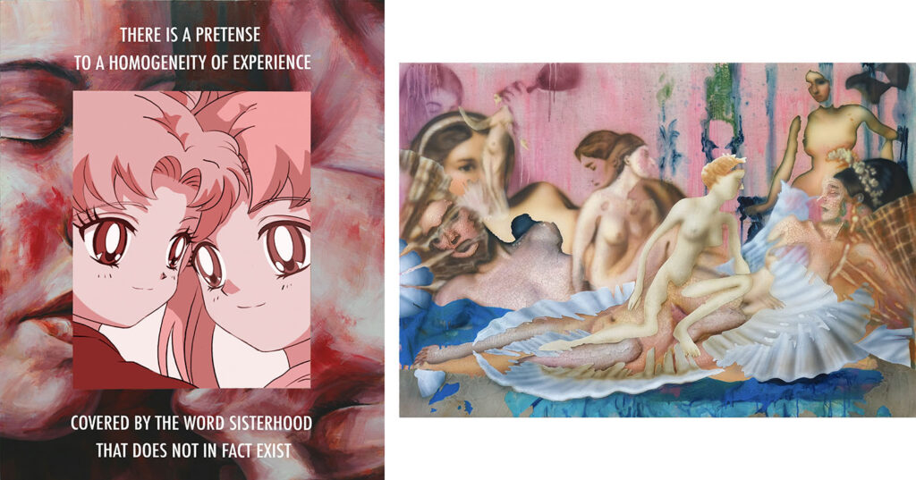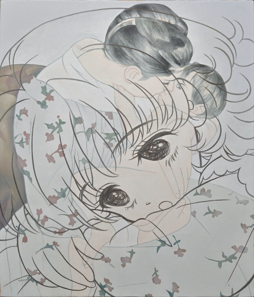 山本れいらは、アニメ・マンガカルチャーに内在する男性優位の視点やアートにおけるその周縁的な位置づけを切り出しつつ、フェミニズムやクィアの視点から新たなキャラクター表象を生み出すことを試みます。出展シリーズのテーマであり、男性中心主義的な社会構造によって分断されてきた女性たちを結び直す理念として掲げられてきた「シスターフッド」は、本来、差異を横断する連帯の可能性を孕むものです。しかし、本シリーズにおいて参照されるオードリー・ロードの言葉が指摘するように、シスターフッドが「同質性」を前提としたとき、それは人種、階級、セクシュアリティ、文化的背景といった差異を不可視化し、異なる立場が交わる過程で生じる摩擦や葛藤、時に決裂に至る経験を周縁化してしまう危険を伴います。差異を抑圧した連帯は、結果として既存の権力構造を再生産するものとなりかねないのです。