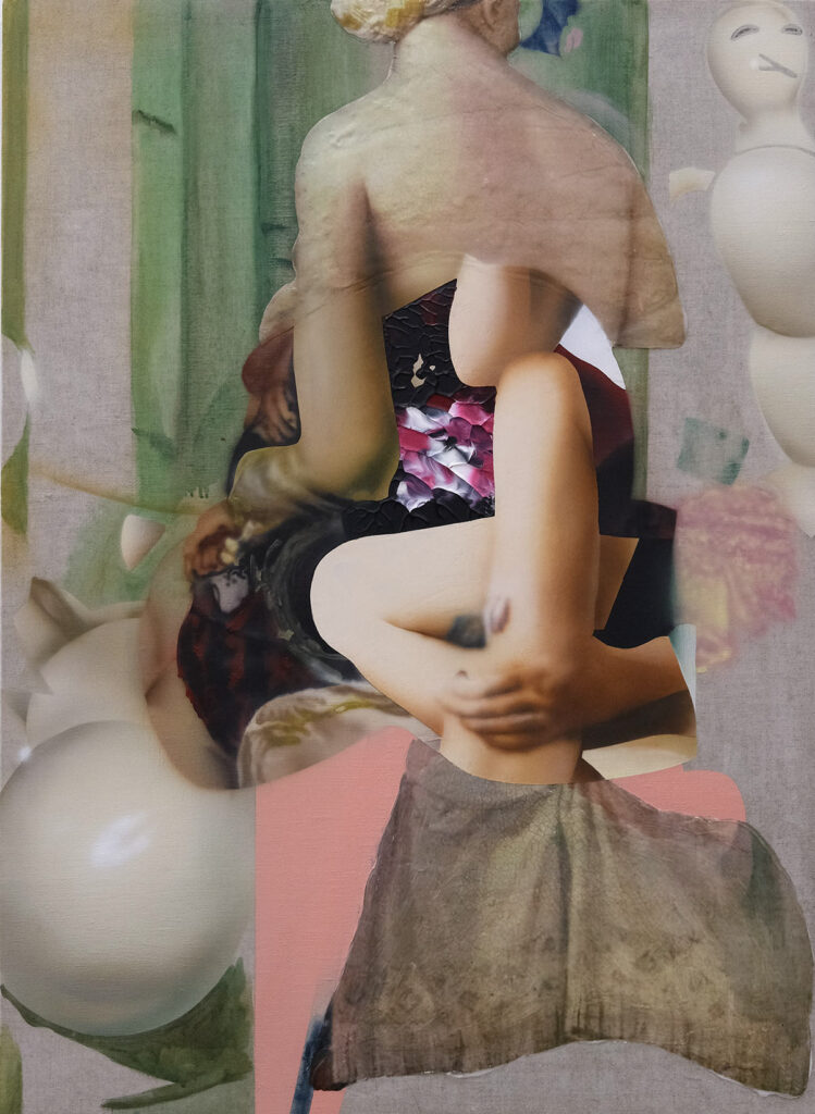 Lea Embeliは、西洋美術史の伝統的な女性像を引用し、それを現代における知能や理想の集合体ともいえるAIによって変形させます。ローマ神話の女神ヴィーナスをモチーフとする出展作品では、AI画像生成モデルによって生み出された複数の不完全なイメージが、キャンバス上で何層にも重ねられています。古代から現代に至る西洋美術史において繰り返されてきた「理想の模倣」という運動をなぞりつつ、同時に、AIとの対話から生じる誤読の痕跡を画面に留めるその手法によって、Embeliは一般化された理想像から抹消されてきた美の可能性を提示します。理想的とされるイメージを出発点としながら、それらが複製・生成される過程で生じる残滓や逸脱を集積するEmbeliの実践は、理想を規範として成立させる力と、それを内側から攪乱する力学の両方を可視化しています。