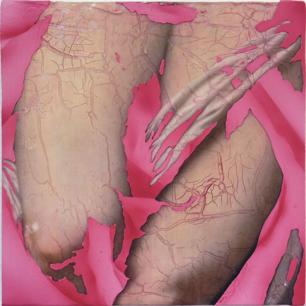 Right : Supernova 1/2, 2025, acrylic on panel, digital print, 250 × 250 mm